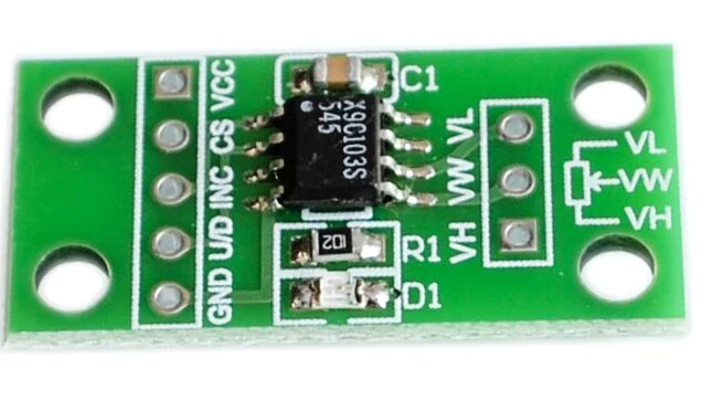 O Módulo potenciômetro digital 10K - X9C103S 3V a 5V é um módulo que conta com o CHIP X9C103S que é um potenciômetro digital de 10K ohm que possui 99 passos, ou seja, 99 variações de resistência, sendo cada passo 101 ohms. A resistência mínima são de 40 ohms. A tensão máxima que pode ser aplicada na alimentação e na parte do potenciômetro são 5V.